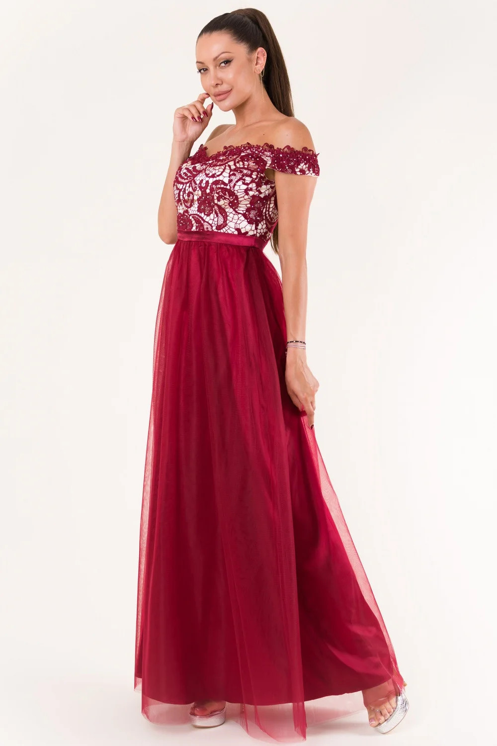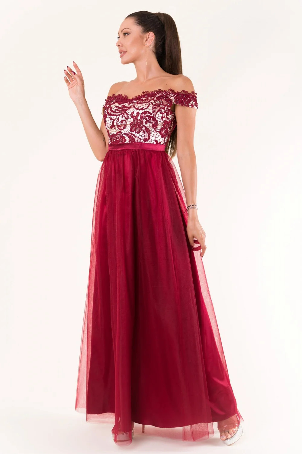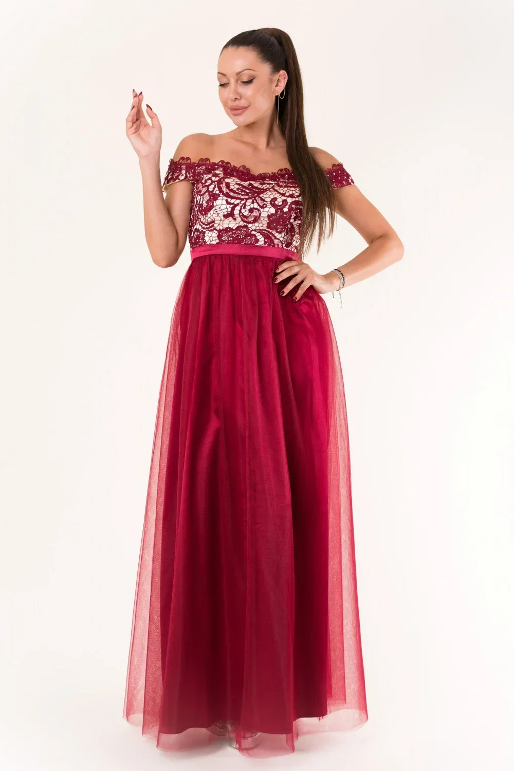 Dlouhé večerní šaty s odhalenými rameny. Šaty jsou v pase přestřižené, dole rozšířené. Horní část zdobená zajímavou výšivkou. Skvěle se hodí pro mnoho příležitostí.