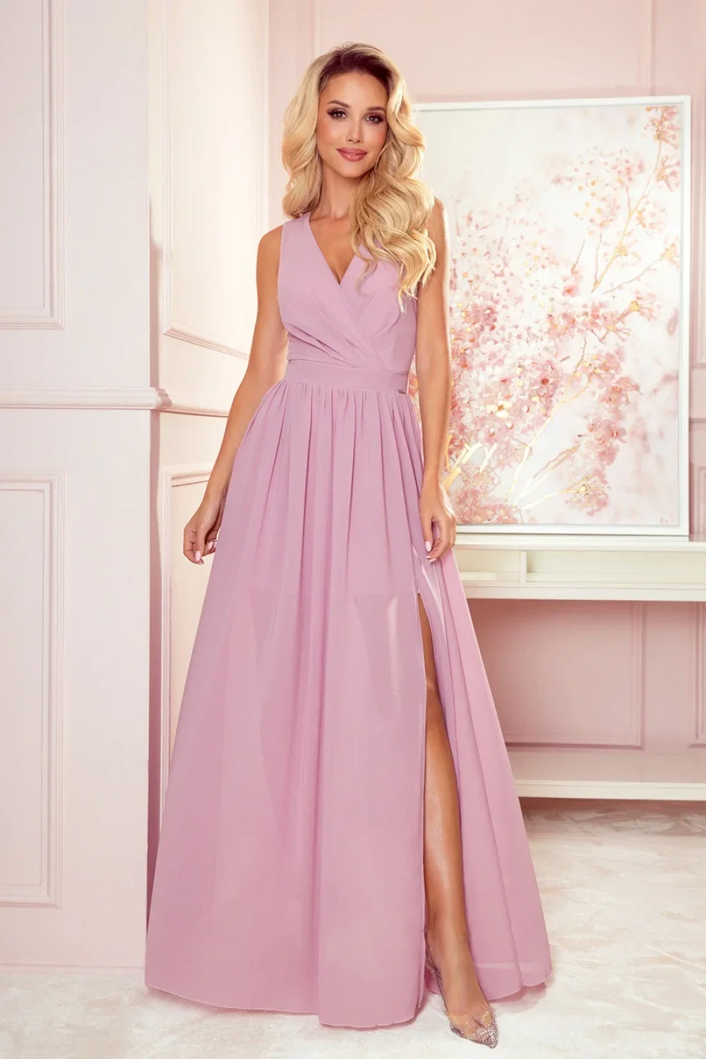 Dlouhé šaty s výstřihem, rozparkem na nohou a zavazováním na zádech. Je vyroben ze vzdušného materiálu v pudrově růžové barvě. Zapíná se vzadu na krytý zip. Polský výrobek. Značka numoco.