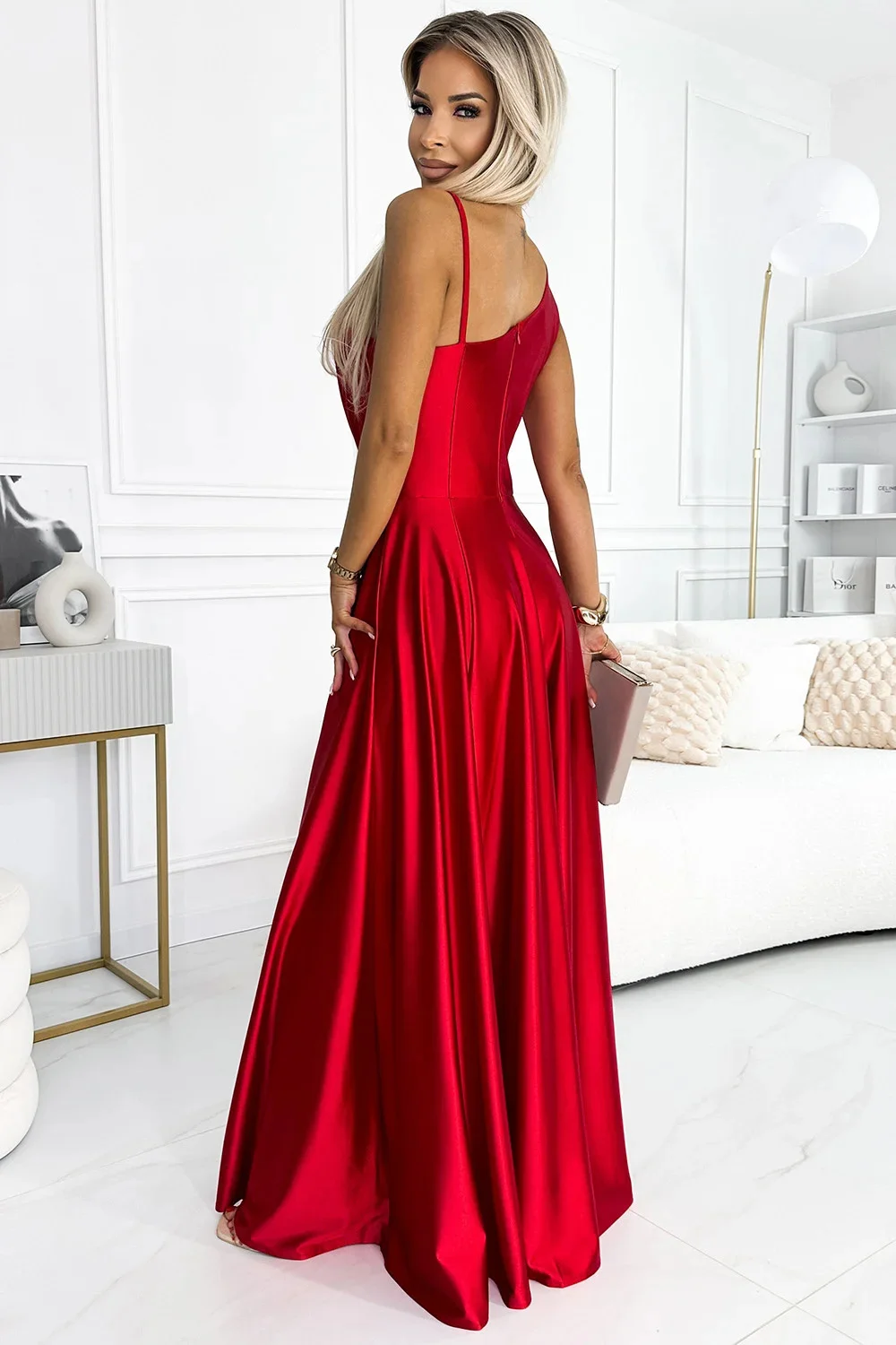 Elegantní maxi dlouhé saténové šaty na jedno rameno. Jsou vyrobeny z lesklého, hladkého, mírně elastického saténu v červené barvě. Šaty ideální na svatbu, Silvestra, ples, karneval a jiné významnější příležitosti. Vyrobeno v Polsku. Značka Numoco.
