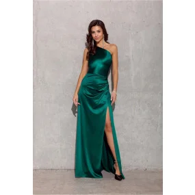 Tyto asymetrické šaty na jedno rameno s rukávy jsou vyrobeny z třpytivé, lesklé látky, která se na slunci krásně leskne. Maxi šaty mají vypasovaný střih, který skvěle přiléhá k tělu, a volánek, který zakryje případné nedokonalosti. Asymetrické šaty mají rozparek odhalující nohy a jeden dlouhý rukáv. Zapínají se na krytý zip umístěný v zadní části šatů. Dlouhé šaty působí velmi elegantně, takže se budou skvěle hodit na velké události, jako jsou svatby, Silvestr nebo plesy. Výrobek je vyroben a ušit v Polsku.