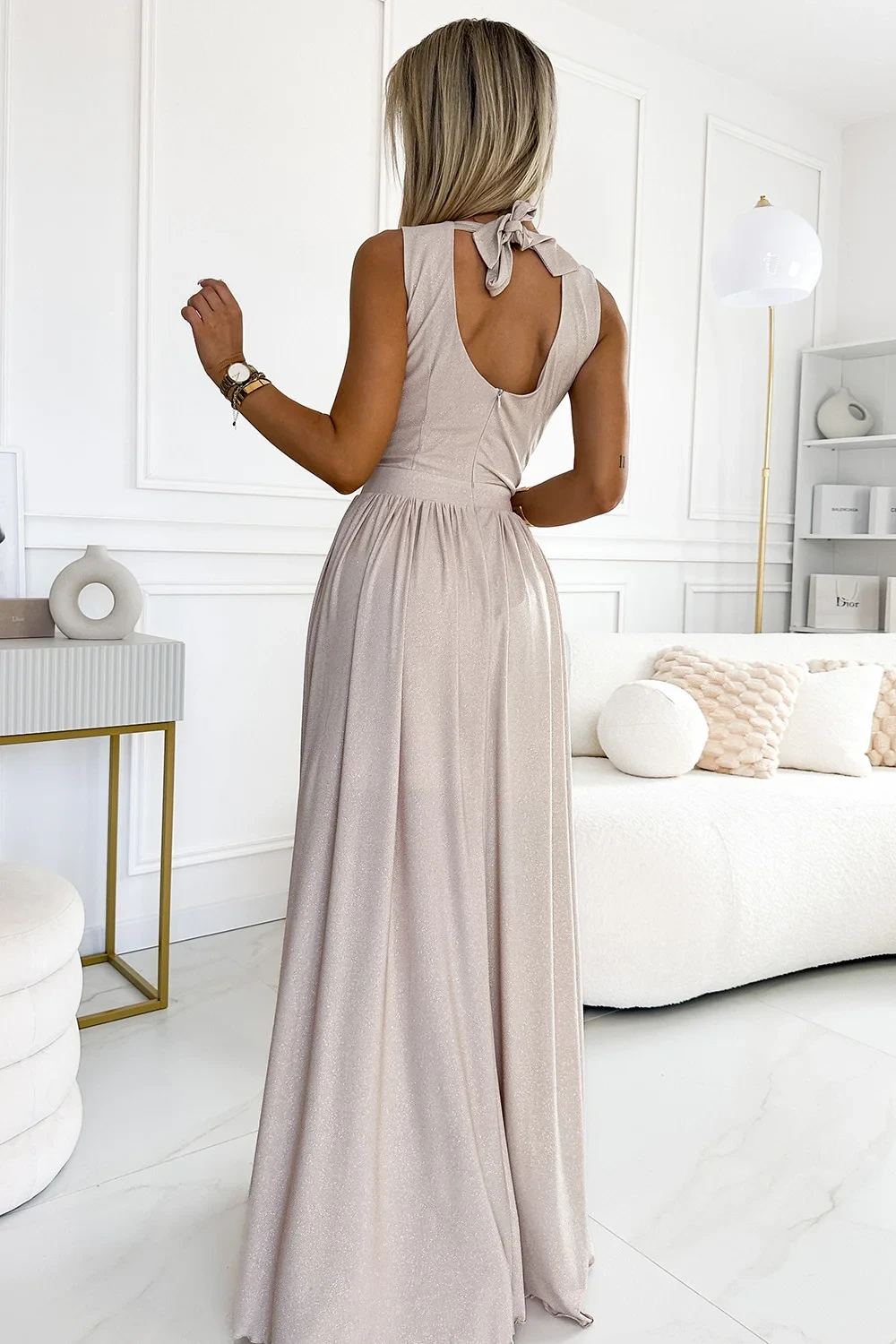 Dlouhé maxi šaty Justine se srdíčkovým výstřihem, rozparkem na nohou a zavazováním na zádech. Vyrobeno z elastické tkaniny. Šaty v béžové barvě s brokátem. Zapínají se vzadu na krytý zip. Polský výrobek. Značka numoco.
