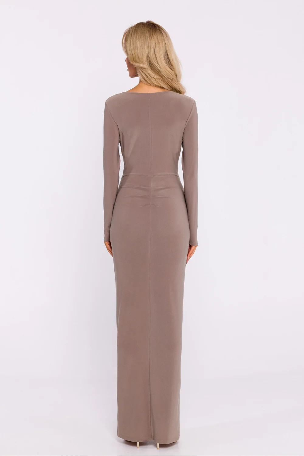 Elegantní společenské šaty z elastického úpletu, který zajišťuje pohodlí při nošení a dokonale přiléhá k postavě. Model v maxi délce s hlubokým výstřihem do V zdůrazňujícím linii poprsí. Střih je přiléhavý, s ozdobným uzlem na přední straně, který dodává stylingu jedinečný charakter, a vysokým rozparkem, který decentně odhaluje nohu. Šaty mají dlouhé rukávy a na zádech jsou modelující záhyby, které opticky zeštíhlují siluetu. Diskrétní zapínání zajišťuje skrytý zip na boku. Šaty nemají podšívku, což zdůrazňuje jejich lehkost. Výrobek navržen a ušit v Polsku.