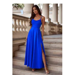 Elegantní a zároveň jednoduché dlouhé šaty s rozparkem na spodku. Šaty se zapínají na skrytý zip. Přední část s vodním výstřihem a tenkými ramínky, zadní část s pleteným šněrováním. Ideální návrh na mnoho příležitostí.