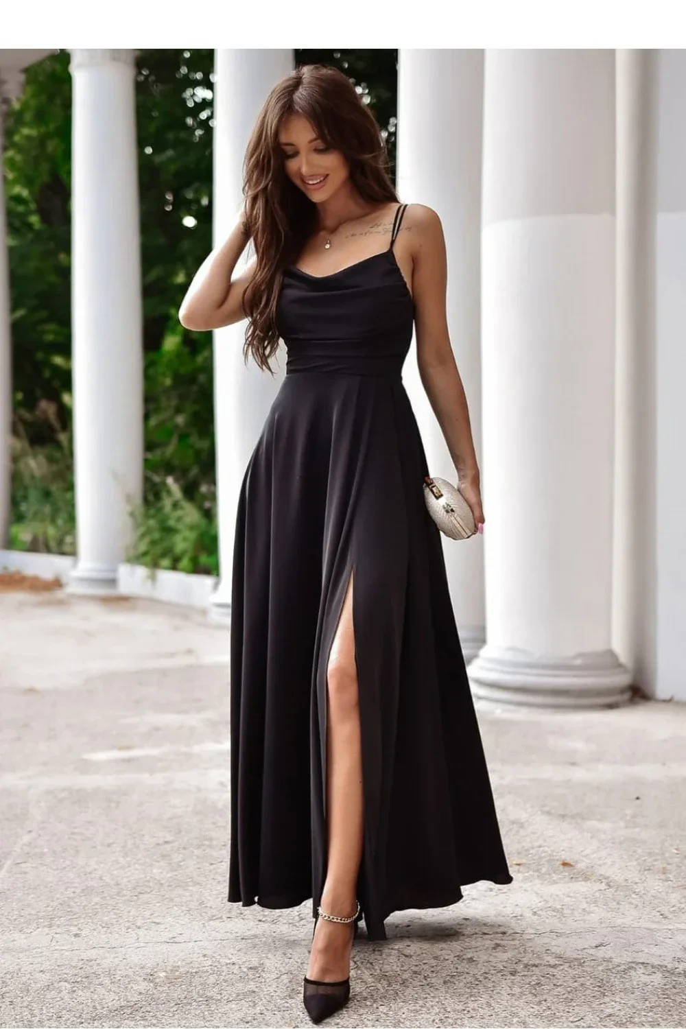 Elegantní, ale zároveň jednoduché dlouhé šaty s rozparkem dole. Šaty se zapínají na skrytý zip. Přední část s výstřihem ve tvaru V a tenkými ramínky, záda s pleteným šněrováním. Skvělý návrh pro mnoho příležitostí.