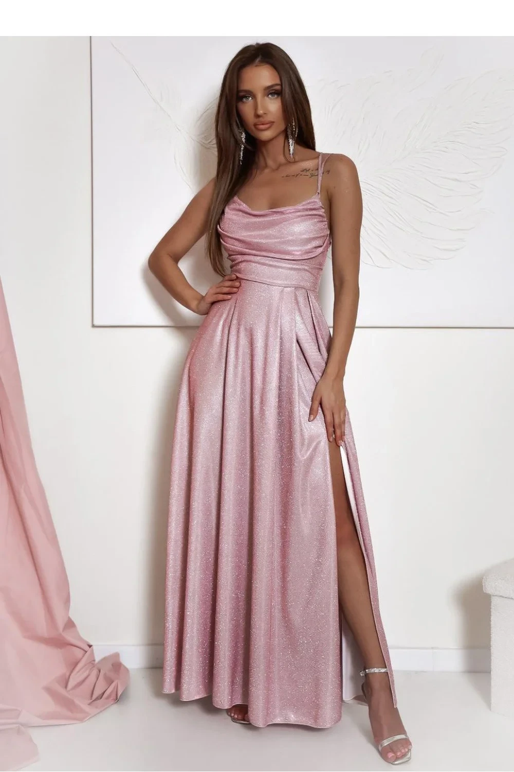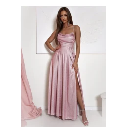 Elegantní a zároveň jednoduché dlouhé šaty s rozparkem dole, vyrobené z lesklé látky. Šaty se zapínají na skrytý zip. Přední část s vodním výstřihem a tenkými ramínky, záda s pleteným šněrováním. Ideální návrh na mnoho příležitostí.