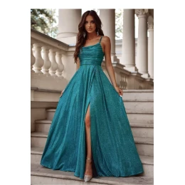Elegantní a zároveň jednoduché dlouhé šaty s rozparkem dole, vyrobené z lesklé látky. Šaty se zapínají na skrytý zip. Přední část s výstřihem na vodu a tenkými ramínky, záda s provázaným šněrováním. Skvělý návrh pro mnoho příležitostí.