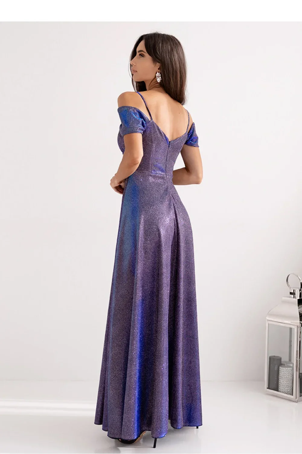 Elegantní dlouhé šaty s přesýpacím výstřihem, tenkými ramínky a rukávy. Šaty se odřezávají v pasu, zapínají se na skrytý zip, spodek je rozkvetlý s rozštěpem. Šaty jsou vyrobeny z lesklého materiálu.