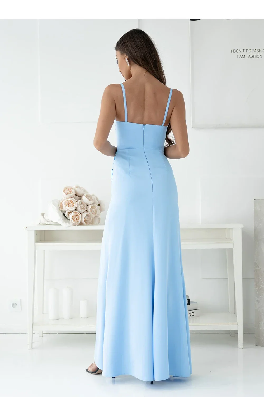Dlouhé šaty s přiléhavým střihem a nastavitelnými ramínky, zapínání na skrytý zip. Hluboký výstřih, dolní část s dlouhým rozparkem. Ideální návrh na mnoho příležitostí.