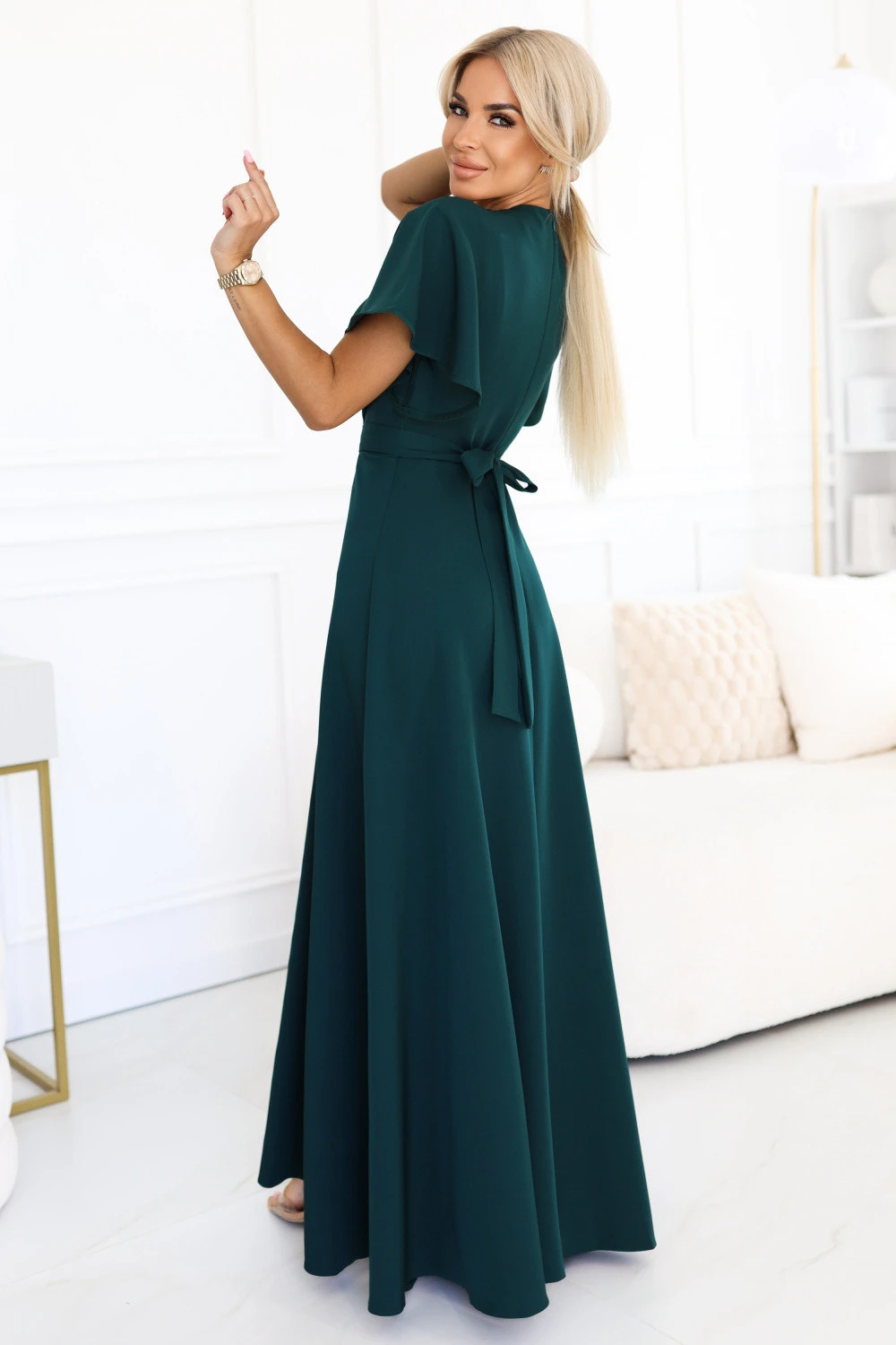 Šaty Jennifer od značky Numoco spojují eleganci a pohodlí v jednom. Maxi model s efektním záhybovým výstřihem krásně zdůrazňuje poprsí a zúží siluetu, zatímco široké, volné rukávy dodávají kreaci lehkost. Vysoké rozparky na noze přidávají smyslný charakter a zdůrazňují ženský půvab. Vyrobené z vysoké kvality materiálu, šaty se dokonale přizpůsobí tělu a zajistí pohodlí během večerních událostí. Hluboká zelená barva dodává šatům nadčasový styl, který se hodí na svatbu, ples, Silvestra, banket, galavečer nebo romantickou večeři.