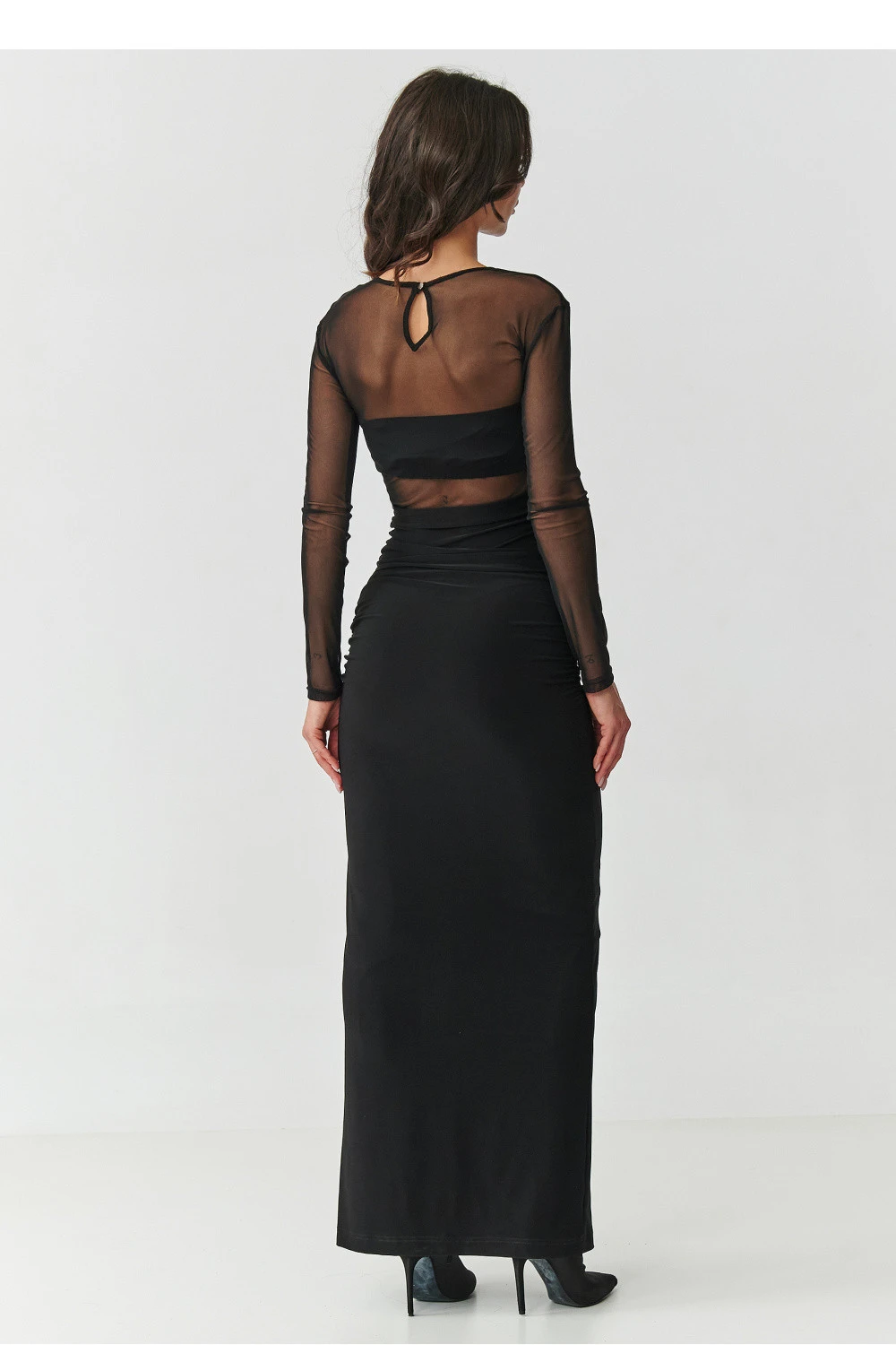 Vstupte do světa elegance, který hypnotizuje už na první pohled. Tato černá maxi šaty s síťkovaným materiálem jsou nabídkou pro ženy, které se nebojí zářit a chtějí se cítit naprosto výjimečně. Přiléhavý střih perfektně zdůrazňuje postavu, zatímco jemné záhyby v pasu formují siluetu, dodávají jí smyslnou lehkost. Průhledný vršek z jemné síťky dává šatům tajemný charakter, kde se elegance setkává s odvahou. Navíc pod tylem je samostatný top, který můžete použít i k jiným stylizacím. Smyslný rozpark odkrývá nohu s každým krokem, přidávající celku ženský magnetismus. Zlatý knoflík na zádech nejen plní praktickou funkci, ale také jim dodává bižuterní charakter, krásně kontrastující s hlubokou černí materiálu. Tento jemný akcent činí šaty luxusně vypadajícími a zároveň je jedinečnými v každém detailu. To nejsou obyčejné večerní šaty, je to kreace, ve které pocítíte, že všechny pohledy jsou upřeny přímo na vás. Skvělé na svatbu, ples, maturitu nebo elegantní večeři, vždy vás odliší svým stylem a sebejistotou. Odvážné, hypnotizující, ideální pro ženu, která chce udělat ohromující dojem a zanechat za sebou nevymazatelnou vzpomínku, jako samotné šaty. Tyl: 100% polyester.