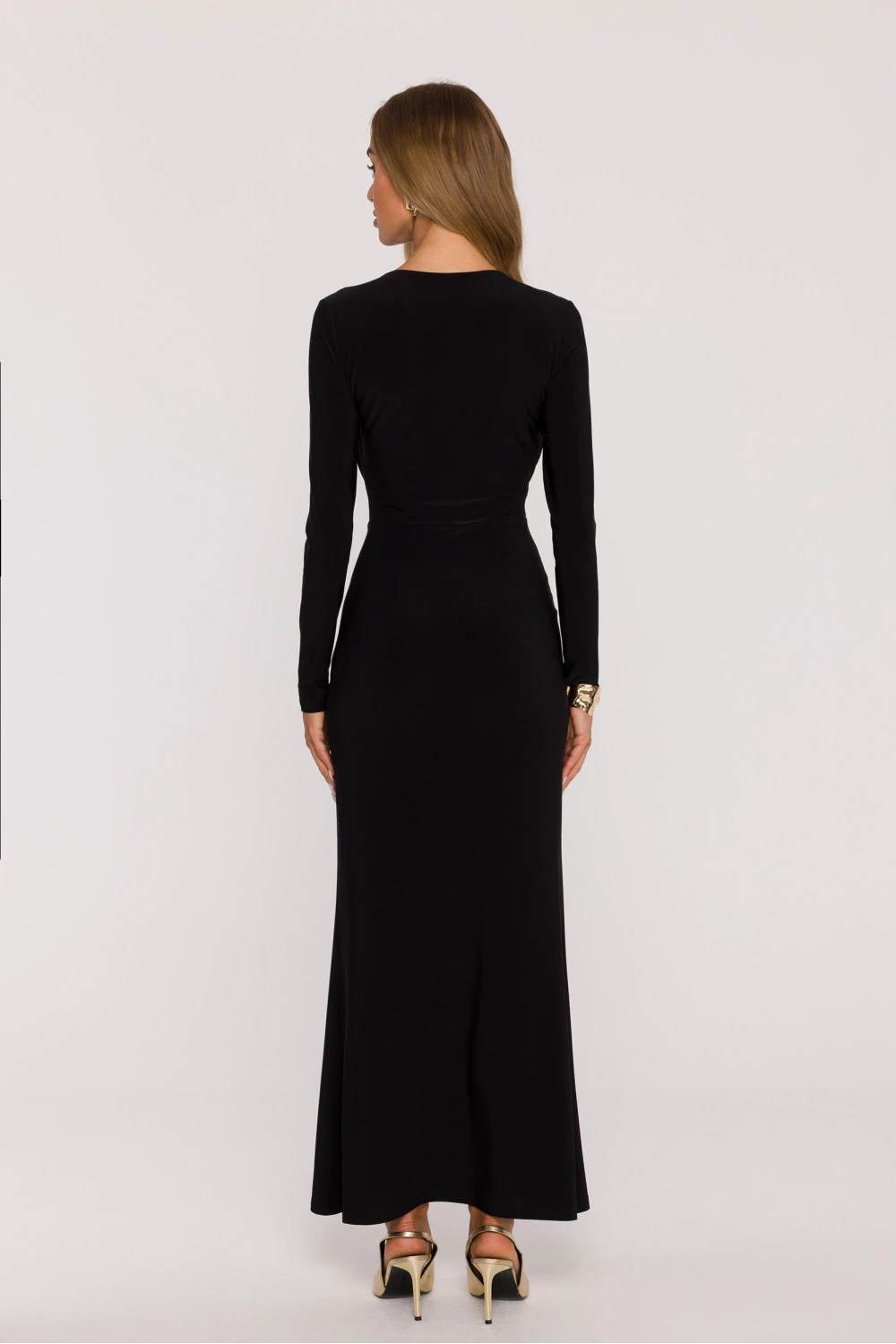 Elegantní a mimořádně ženské maxi šaty M891 jsou vyrobeny z hladké pleteniny, která ohromuje svou jemností, pružností a pohodlím nošení. Materiál se krásně přizpůsobuje postavě, zároveň neomezuje pohyb. Model je zdoben výstřihem ve tvaru písmene V, který jemně zdůrazňuje linii krku a dekoltu, a dlouhými, přiléhavými rukávy, které dodávají celku elegantní charakter. Pas s jemným zkrýváním zdůrazňuje ženské tvary, a dlouhá, lehce rozšířená sukňová část vytváří smyslnou a štíhlou linii postavy. Další výhodou je oddělený šátek, který lze různými způsoby stylizovat a uvázat kolem krku, pasu nebo použít jako ozdobu vlasů. Šaty nemají kapsy ani podšívku, což zajišťuje jejich lehkost, a zakrytý zip na boku zaručuje pohodlné oblékání a estetické dokončení. Model byl navržen a ušit v Polsku s důrazem na každý detail. Je to nabídka pro ženy, které oceňují minimalistickou eleganci, pohodlí a nadčasový styl.