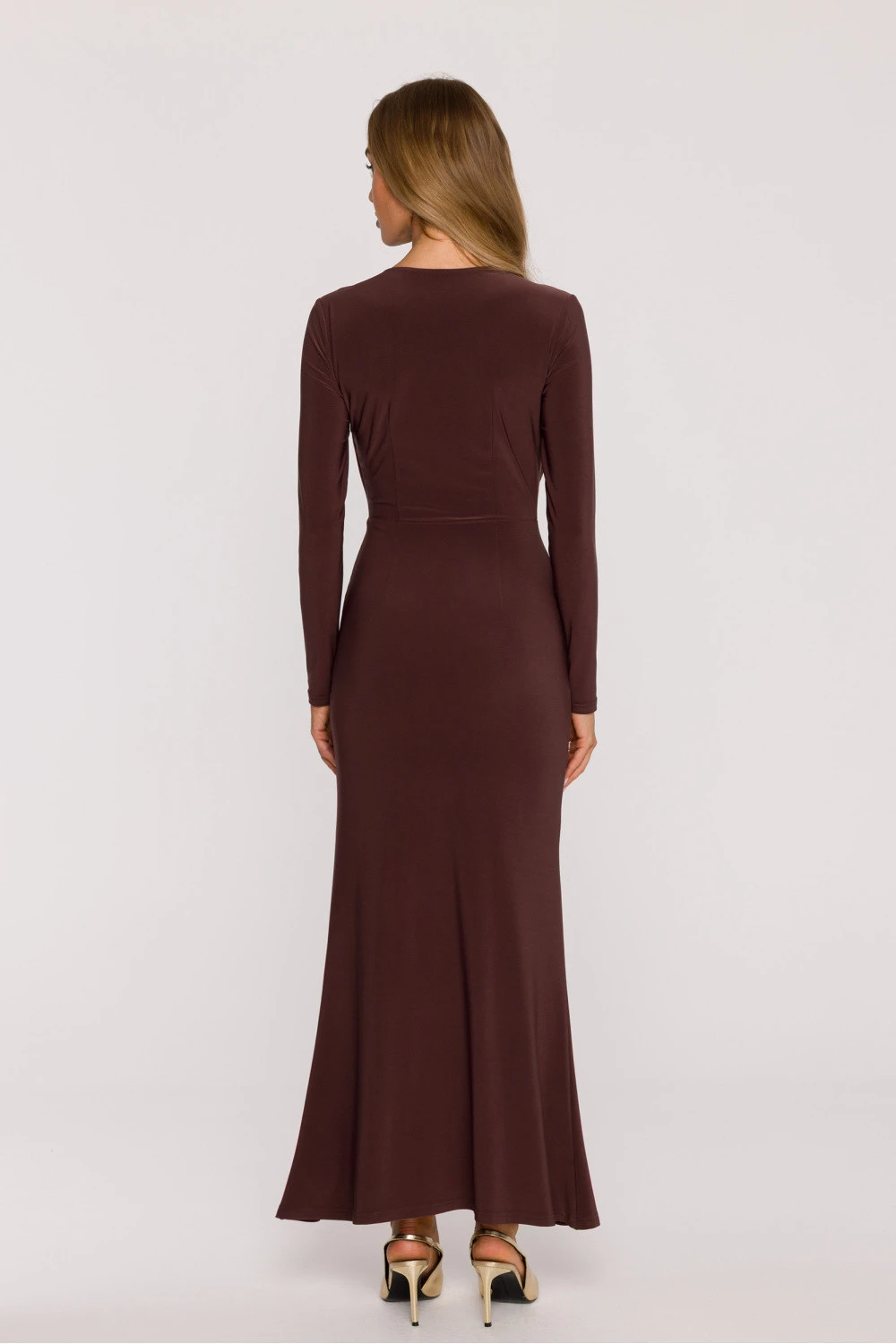 Elegantní a mimořádně ženské maxi šaty M891 jsou vyrobeny z hladké pleteniny, která okouzluje svou měkkostí, pružností a pohodlností nošení. Materiál se krásně přizpůsobuje postavě, aniž by omezoval pohyb. Model je zdoben Výstřihem, který jemně zdůrazňuje linii krku a dekoltu, a dlouhými, přiléhavými rukávy, které dodávají celku elegantní charakter. Pás s jemným zástřihem zdůrazňuje ženské tvary a dlouhé, lehce rozšířené dno vytváří smyslnou a štíhlou linii postavy. Další výhodou je samostatný šátek, který lze nosit různými způsoby - uvázat kolem krku, v pase nebo použít jako ozdobu do vlasů. Šaty nemají kapsy ani podšívku, což zajišťuje jejich lehkost, a zakrytý zip na boku zaručuje snadné oblékání a estetické dokončení. Model byl navržen a ušit v Polsku s důrazem na každý detail. Jedná se o nabídku pro ženy, které ocení minimalistickou eleganci, pohodlí a nadčasový styl.