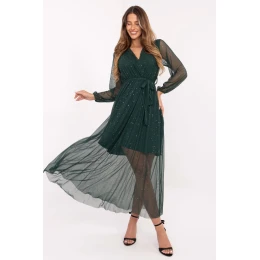 Úchvatné šaty elegantního rozkroku, které se ideálně hodí na speciální příležitosti, oslavy nebo večerní vycházky. Vyrobené z vysoce kvalitního polyesteru s přídavkem elastanu, krásně padnou na postavě, zajišťují pohodlí a volnost pohybu. Tkanina s lesklými prvky jemně září ve světle, dodávající kreaci výjimečný, návštěvnický charakter. Obálkový výstřih smyslně zdůrazňuje dekolt a krk, zatímco vázání v pasu zdůrazňuje pas a přidává ženskou eleganci. Dlouhý rukáv a podšívka zaručují pohodlí a elegantní dokončení. Maxi délka dodává šatům eleganci a dělá je neuvěřitelně efektními při každém pohybu. Tento model je určen pro ženy, které chtějí spojit klasickou eleganci s jemným leskem.