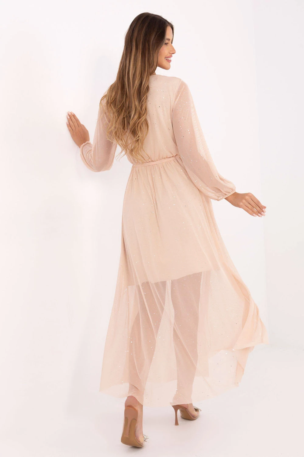 Oslnivající elegantní šaty s rozkročeným střihem, které se skvěle hodí na speciální příležitosti, slavnosti nebo večerní vycházky. Vyrobeno z vysoce kvalitního polyesteru s přídavkem elastanu, krásně padne na postavu, zajišťuje zároveň pohodlí a volnost pohybu. Tkanina s lesklými prvky jemně září ve světle, dodávající kreaci výjimečný, slavnostní charakter. Klopový výstřih smyslně zdůrazňuje dekolt a krk, a šněrování v pasu zdůrazňuje tali a dodává ženskou eleganci. Dlouhý rukáv a podšívka zaručují pohodlí a elegantní dokončení. Maxi délka dodává šatům eleganci a dělá je mimořádně efektními při každém pohybu. Tento model je určen pro ženy, které chtějí spojit klasickou eleganci s jemným leskem.
