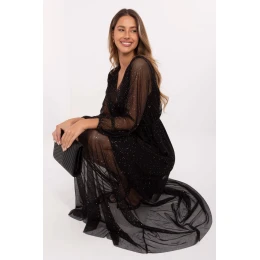 Oslnivý šaty elegantního rozklosovitého střihu, které se skvěle hodí na speciální příležitosti, slavnostní události nebo večerní vycházky. Vyrobeno z vysoce kvalitního polyesteru s přídavkem elastanu, krásně padne na postavu, zajišťuje zároveň pohodlí a volnost pohybu. Tkanina s lesklými prvky jemně září ve světle, dodávají kreaci výjimečný, reprezentační charakter. Přesýpací výstřih smyslně zdůrazňuje dekolt a krk, a uvazování v pase zdůrazňuje pas a dodává ženský šarm. Dlouhý rukáv a podšívka zaručují pohodlí a elegantní dokončení. Maximální délka dodává šatům eleganci a dělá je nesmírně efektními při každém pohybu. Jedná se o model vytvořený pro ženy, které touží spojit klasickou eleganci s jemným leskem.