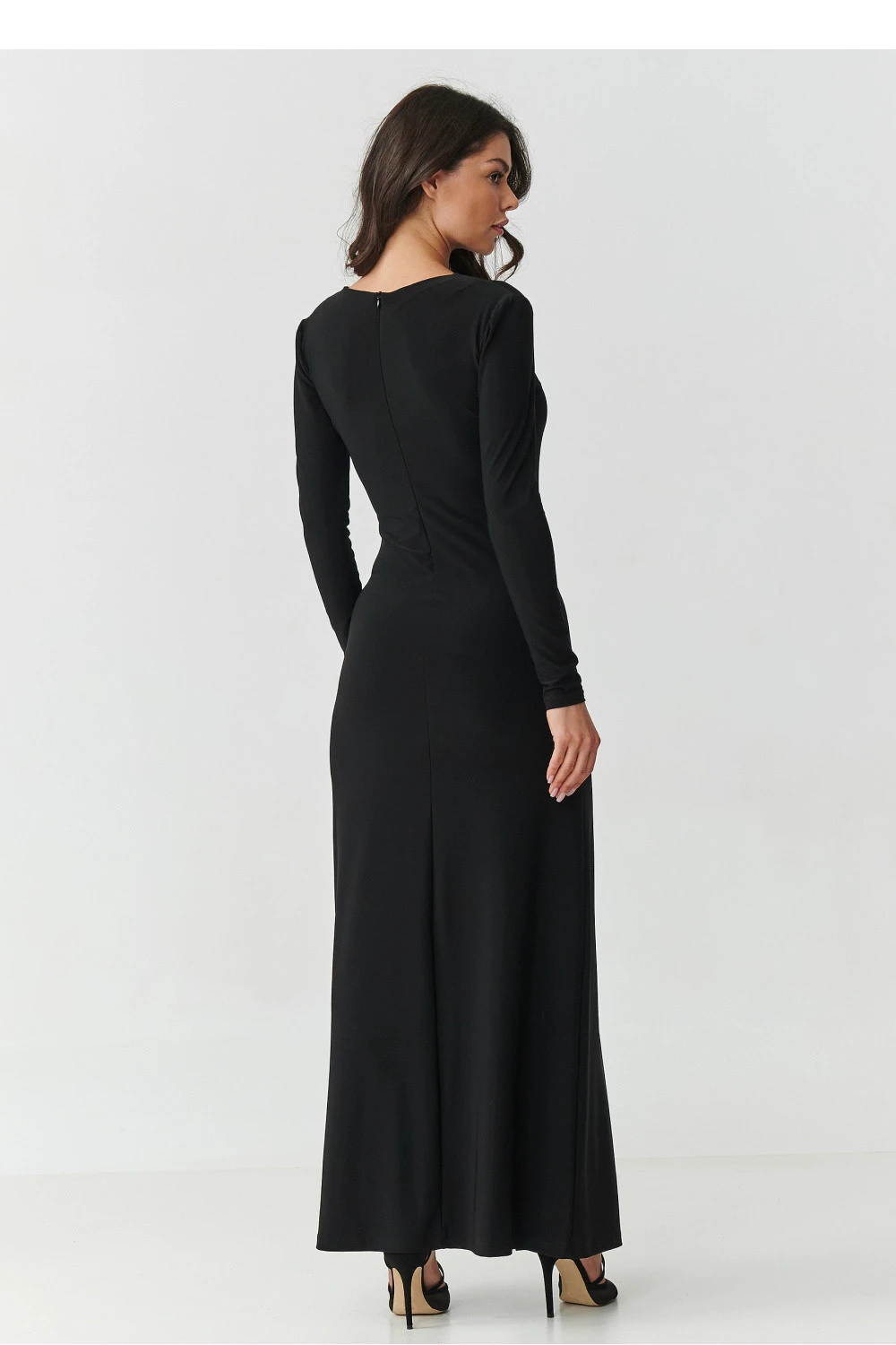 Oslavte všechny jedinečným vzhledem! Tato černá maxi šaty z elastického materiálu jsou ideální kombinací elegance a modernosti. Přizpůsobený střih krásně zdůrazňuje postavu a asymetrické rozříznutí na noze přidává nádech ženské elegance a sexapilu. Jemné výstřihy u dekoltu a dlouhé rukávy dělají z tohoto modelu ideální volbu pro elegantní večírky, plesy nebo romantické večeře. Šaty vyrobené z vysoce kvalitního materiálu nejsou jen efektní, ale také velmi pohodlné, lehce elastické, měkké a odolné proti vráskám. vsaďte na klasiku a ženskost v nejlepším provedení!