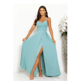 Elegantní a zároveň jednoduché dlouhé šaty s rozparkem dole. Šaty se zapínají na skrytý zip. Přední strana s vodním výstřihem a tenkými ramínky, zadní strana s pleteným šněrováním. Ideální návrh na mnoho příležitostí.