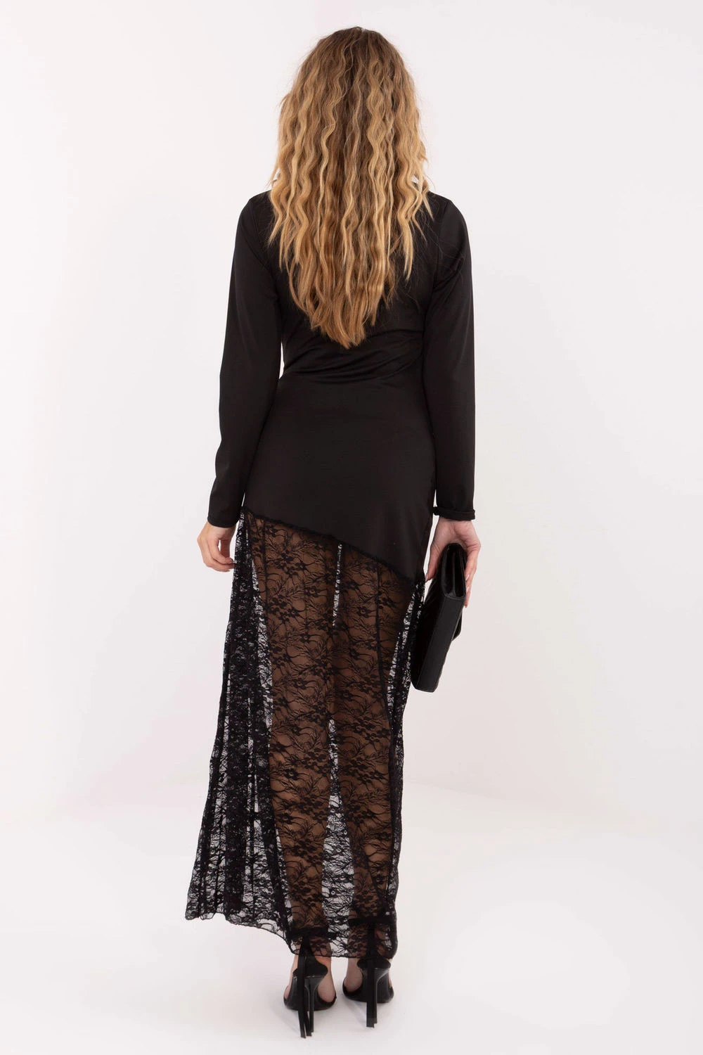 Elegantní úzká maxi šaty, vyrobené z dominantního materiálu polyester plus elastan s různými texturami, které krásně padnou a zdůrazňují přirozené linie postavy. Model zaujme klasickým lodním výstřihem a dlouhým rukávem, díky čemuž vypadá velmi elegantně a hodí se jak na slavnostní události, tak do každodenních stylizací. Spodní část šatů zdobí jemná krajková výšivka, která přidává subtilní ženskost a lehkost. Další ozdobné záhyby zdůrazňují charakter střihu a dodávají projektu stylový výraz. Šaty nemají zapínání, což zvyšuje pohodlí nošení a zajišťuje hladkou linii postavy. Model ideální pro ženy, které oceňují rafinovanou jednoduchost s nádechem elegantních detailů.