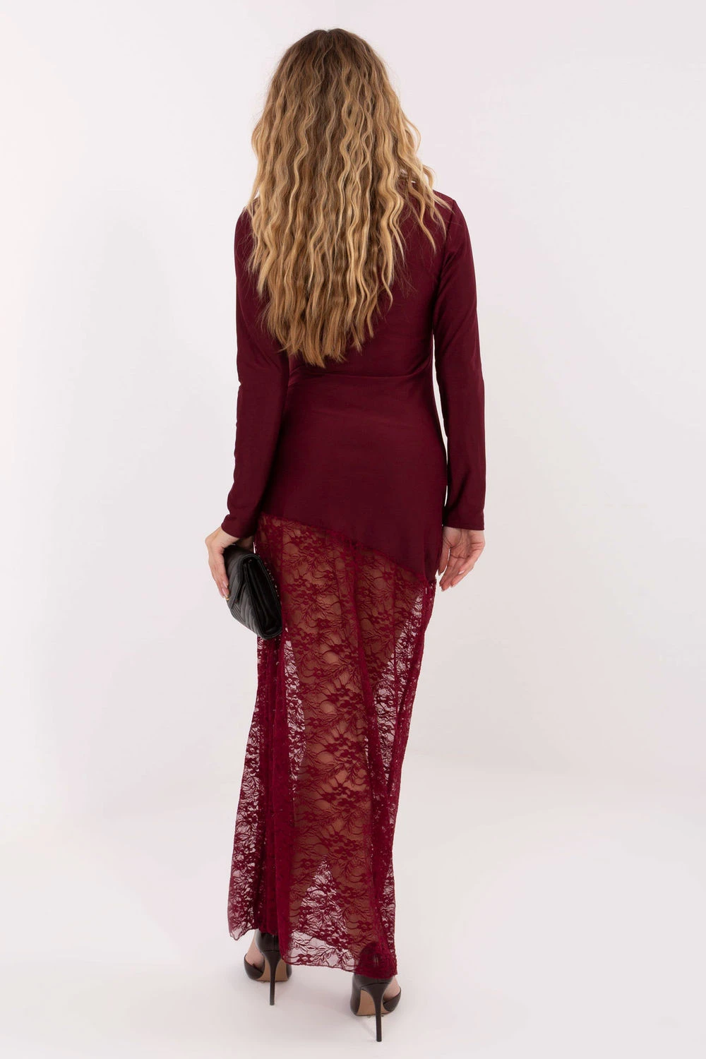 Elegantní úzký šaty v délce maxi, vyrobený z dominantního materiálu polyesteru a elastanu s různorodou fakturou, který krásně padne na postavu a zdůrazňuje její přirozené linie. Model zaujme klasickým dekoltem typu lodička a dlouhým rukávem, díky čemuž vypadá mimořádně elegantně a hodí se jak na slavnostní příležitosti, tak i do každodenních stylizací. Spodní část šatů zdobí jemná krajková ozdoba, která přidává subtilní ženskost a lehkost. Další dekorativní záhyby zdůrazňují charakter střihu a dodávají projektu stylový výraz. Šaty nemají zapínání, co zvyšuje pohodlí nošení a zajišťuje hladkou linii postavy. Model ideální pro ženy, které oceňují rafinovanou jednoduchost s nádechem elegantních detailů.