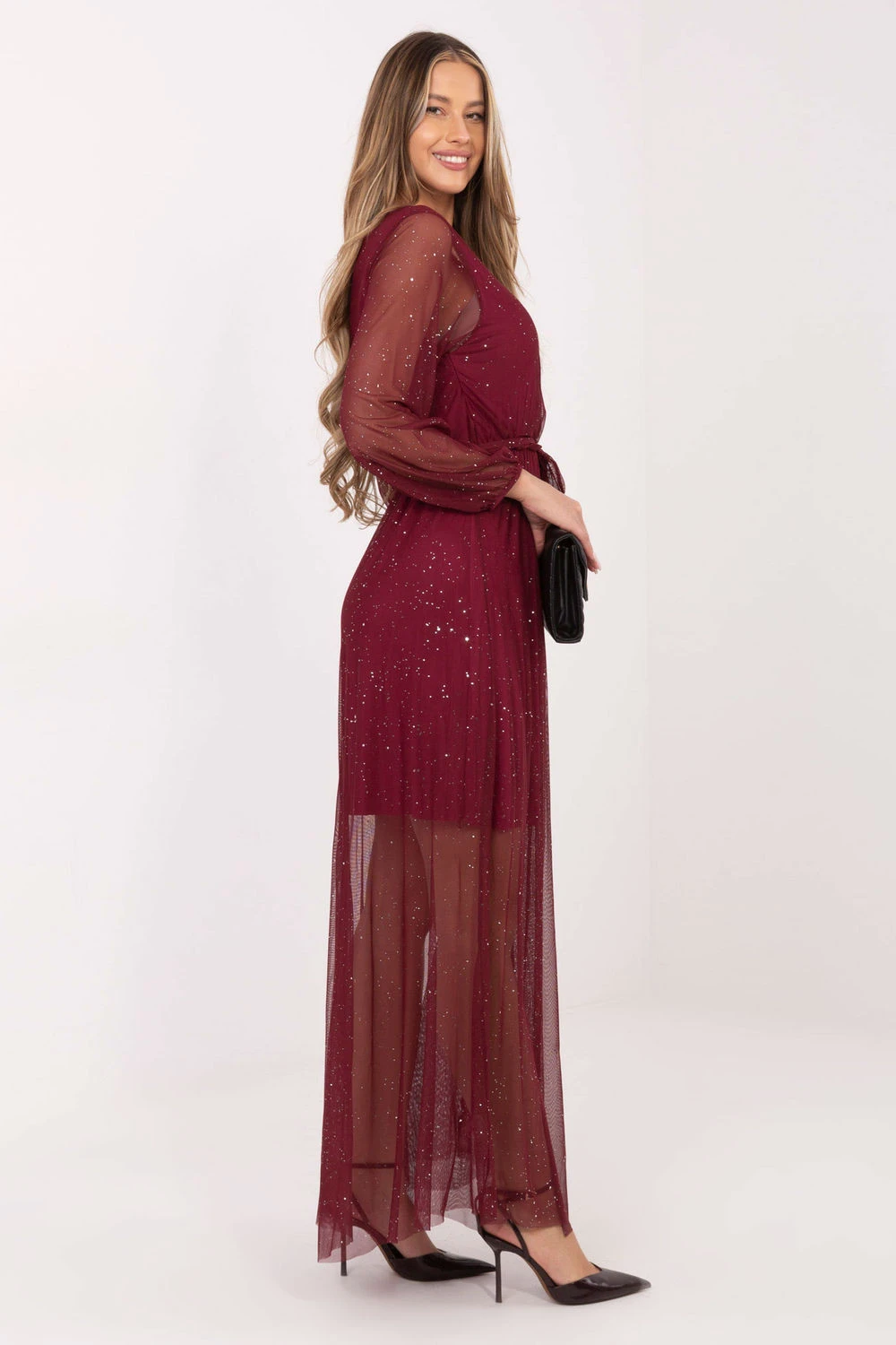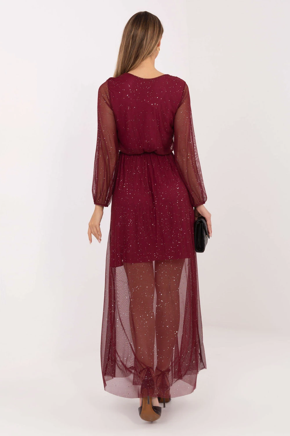 Elegantní maxi šaty z síťoviny jsou výjimečným návrhem na společenské události, ideální pro ženy, které oceňují jemný lesk a lehkost. Vyrobena z polyesterové směsi a viskózy, působí efektně a zároveň poskytuje pohodlí díky měkké podšívkce. Model s rozšířeným střihem se krásně skládá při pohybu, vytvářejíc ženskou a vzdušnou siluetu. V pasu je vsazena guma a šňůrka k vázání, která zdůrazňuje pas a umožňuje přizpůsobit přizpůsobení podle vlastních preferencí. Dlouhý rukáv z jemné síťoviny, kulatý výstřih a lesklé prvky na materiálu dodávají šatům elegantní a večerní charakter. Maxi délka dále zdůrazňuje její elegantní styl. Stylové, ženské a neuvěřitelně efektní, ideální na oslavy, slavnostní události a speciální akce.