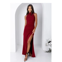 Elegantní a smyslné večerní šaty, vytvořené s ohledem na ty nejvýjimečnější příležitosti. Model okouzlí precizním střihem, který krásně podtrhuje siluetu a zaručuje spektakulární efekt při každém výstupu. Dlouhá, lehce rozšířená ke dnu sukně dodává postavě lehkost a krásně se skládá při pohybu. Vysoký, efektní rozpark vzadu. Smyslný rozpark odhaluje nohu, dodává kreaci elegantní, ale odvážný charakter. Horní část šatů byla decentně drapována, což maskuje případné nedokonalosti a přidává luxusní završení. Výstřih je zdoben elegantní stojáčkem a působí nesmírně stylově a prodlužuje linii krku. Šaty mají střih bez rukávů, který krásně zdůrazňuje ramena a dodává lehkost celému outfitu. V zadní části šatů je efektní dlouhá pásek uvázaná kolem krku, která tvoří elegantní mašličku nebo volně visí, dodávající kreaci výjimečný charakter. Navíc model má tenká stabilizační ramínka. Materiál jemně padá na tělo, jemně září a je pohodlný na nošení po celý večer.