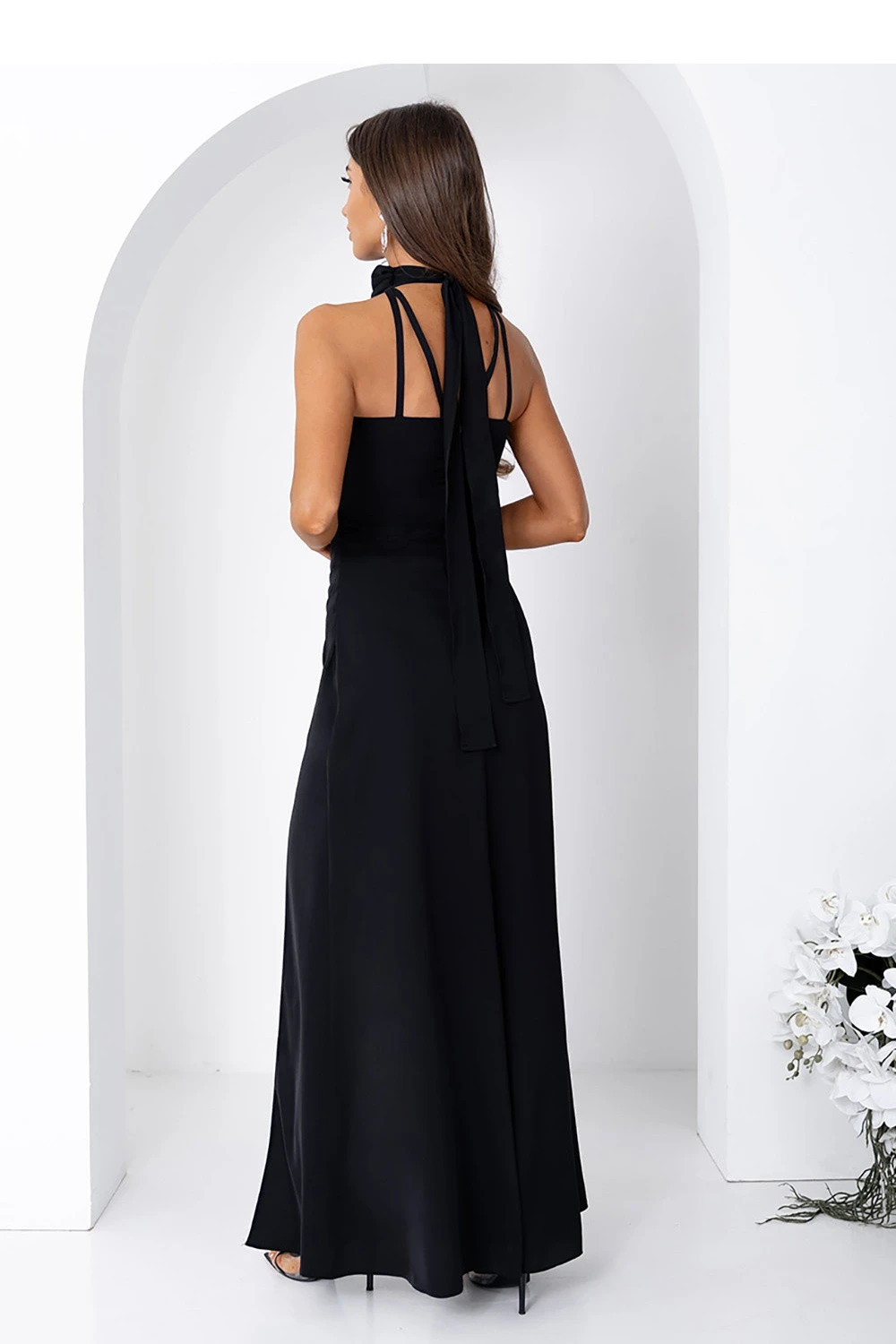 Elegantní a smyslné večerní šaty, vytvořené s ohledem na ty nejvýjimečnější příležitosti. Model ohromuje precizním střihem, který krásně zdůrazňuje siluetu a zaručuje spektakulární efekt při každém výstupu. Dlouhá, lehce rozšířená ke dnu sukně dodává postavě lehkost a krásně se skládá při pohybu. Vysoký, efektní rozparek vpředu. Smyslný rozparek odhaluje nohu, dodává kreaci elegantní, ale odvážný charakter. Horní část šatů byla jemně drapována, což maskuje případné nedokonalosti a přidává luxusní dokončení. Výstřih zakončený elegantní stojáčkem vypadá mimořádně elegantně a prodlužuje linii krku. Šaty mají střih bez rukávů, který krásně zdůrazňuje ramena a dodává lehkost celému stylu. Vzadu šatů je efektní, dlouhá stuha uvázaná kolem krku vytváří elegantní mašličku nebo volně klesá, dodávajíc kreaci výjimečný charakter. Kromě toho má model tenké stabilizační ramínka. Materiál se jemně skládá na těle, jemně leskne a je pohodlný na nošení po celý večer.
