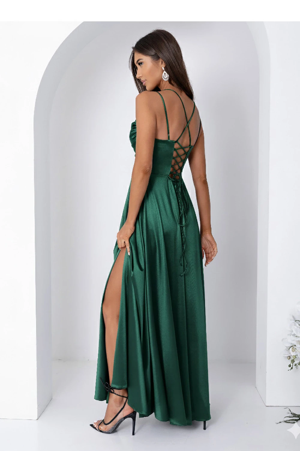 Dlouhé šaty s tenkými ramínky okouzlují elegantní, ženskou formou a propracovanými detaily. Tekoucí výstřih jemně padá na hrudi, dodávající stylizaci lehkost a jemnou smyslnost. Efektní rozřez na noze zvýrazňuje postavu a dodává celku výrazný charakter. Zadní část šatů zdobí dekorativní šněrování, které umožňuje ideální přizpůsobení postavě a představuje výjimečný akcent. Model se zapíná na skrytý zip umístěný na levém boku, co zajišťuje pohodlí nošení a estetické provedení. Šaty se skvěle hodí na večerní výstupy, večírky a speciální příležitosti.