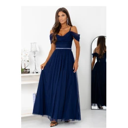 Tmavě modré večerní šaty s rozparkem a odkrytými rameny jsou kvintesencí elegance a ženskosti. Vyrobené z lehkého, vzdušného materiálu se krásně tvarují podle siluety, zdůrazňují pas a zeštíhlují postavu. Model má jemně padající ramínka typu off shoulder, která jemně odhalují ramena a výstřih. Hluboký rozpark na noze dává kreaci smyslný charakter, a přiléhavý korzet a tenký lesklý pás dodávají celku zvláštního šarmu. Zvláštní ozdobou těchto šatů je dekorativní pás zapínající se na knoflíky, který efektně zdůrazňuje pas. Pás je zdoben lesklými detaily, díky čemuž přidává kreaci zvláštní, bižuterní akcent a přitahuje pohled subtilním zářením. Tyto tmavě modré dlouhé šaty z tylu se skvěle hodí na svatbu, ples, maturitní ples, Silvestra nebo jinou elegantní událost. Spojte je se střevlíky a jemnými šperky, abyste vytvořili nadčasový, ženský outfit.