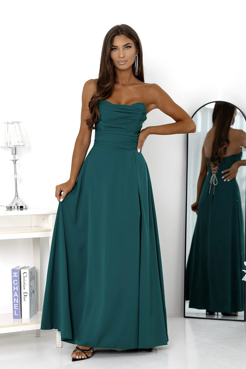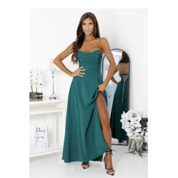 Dlouhé šaty vyrobené z hladkého, lesklého materiálu. Model s připevněnými ramínky, jemně nažehleným vrškem a efektním, vysokým rozparkem na noze. Zadní část je dokončena nastavitelným korzetovým šněrováním, které dokonale přizpůsobuje šaty postavě, dodatečný zip zakrytý na boku. Rozkročený spodek se krásně skládá v pohybu, vytvářejíc lehký, elegantní efekt. Ideální na maturitní ples, Silvestra a jiné speciální příležitosti.