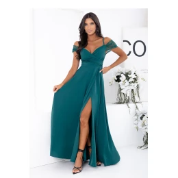 Elegantní maxi šaty v barvě tmavě zelené, vytvořené s ohledem na speciální události. Model s ženským, přiléhavým střihem, který krásně zdůrazňuje pas a zeštíhluje postavu. Vrchní část šatů okouzluje záhybovým výstřihem ve tvaru písmene V, který jemně zdůrazňuje poprsí. Odkryté ramena zdobí jemné, flitrové rukávky, které dodávají celkovému vzhledu lesk a večerní charakter. Tenká ramínka zajišťují stabilitu a pohodlí nošení. V pasu je použit ozdobný pásek s flitrovým zpracováním, který efektně zdůrazňuje proporce postavy. Dlouhá, lehce rozkročená sukně vyrobena z tekoucího materiálu krásně padne do pohybu, a vysoký rozparek na noze dodává smyslnost a lehkost. Šaty se zapínají vzadu na skrytý zip, což zaručuje ideální přizpůsobení a estetické dokončení. Ideální volba na: svatbu, ples, maturitní ples, společenské události, elegantní večerní výstupy.