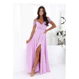 Elegantní maxi šaty v barvě lilie, vytvořené s ohledem na zvláštní příležitosti. Model s ženským, přizpůsobeným střihem, který krásně zdůrazňuje pas a zeštíhluje postavu. Horní část šatů ohromuje zavinovým výstřihem ve tvaru písmene V, který jemně zdůrazňuje prsa. Odkryté ramena zdobí jemné, cekínové rukávky, které celkovému vzhledu dodávají lesk a večerní charakter. Tenká ramínka zajistí stabilitu a pohodlí při nošení. V pasu je použit ozdobný pás s cekínovým zakončením, který efektně zdůrazňuje proporce postavy. Dlouhá, lehce rozkročená sukně vyrobená z tekoucího materiálu krásně padne do pohybu, a vysoké rozparky na noze dodávají smyslnost a lehkost. Šaty se zapínají vzadu na skrytý zip, což zaručuje ideální přizpůsobení a estetické dokončení. Ideální návrh na: svatbu, ples, maturitní ples, společenské akce, elegantní večerní výstupy.