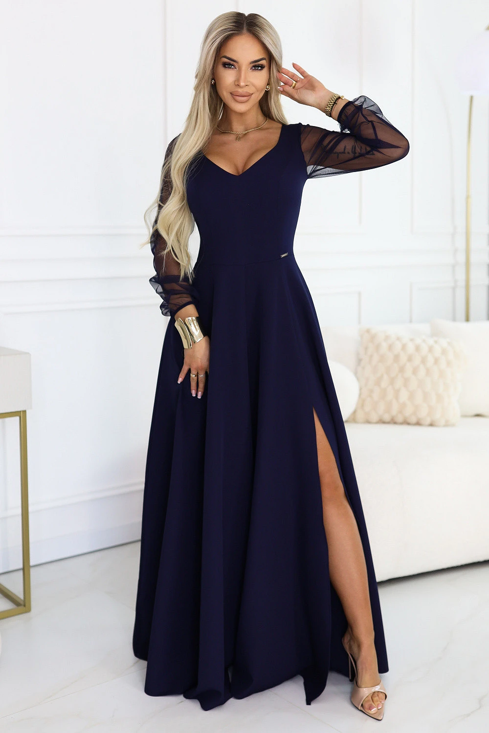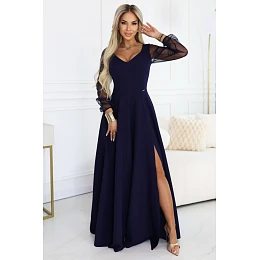 Tato jedinečná tmavě modrá maxi šaty značky Numoco spojuje klasickou eleganci a moderní dokončení, které přitahuje pozornost od prvního pohledu. Hladký, dokonale padnoucí vršek krásně zdůrazňuje pas, zatímco rozkročený spodek zajišťuje lehkost a volnost pohybu. Průhledné síťové rukávy přidávají kreaci jemnou smyslnost, zároveň zachovávají její nadčasový charakter. Jedná se o ideální návrh na svatbu, maturitní ples, ples, galavečer, Silvestra nebo večerní setkání. Šaty vypadají velmi efektně jak při pohybu, tak na fotografiích, díky čemuž vytvářejí stylizaci, která dlouho zůstává v paměti. Pokud hledáte šaty, ve kterých se budete cítit elegantně, sebejistě a opravdu jedinečně, tento model bude skvělou volbou. Výroba polská.