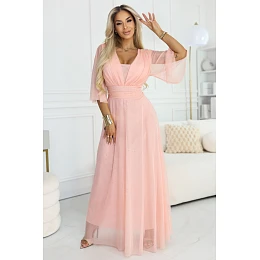 Při plánování svatby nebo rodinné oslavy je důležitá pohodlnost a jistota, že střih dobře sedí po celý den. Tato maxi šaty ve velikosti plus size v broskvovém odstínu se krásně prezentují v pohybu a univerzální velikost poskytuje volnost přizpůsobení se postavě. Model má přední Výstřih v podobě obálky a efektní Výstřih na zádech. Volné tylové rukávy délky 3/4 zajistí pohodlí a lehce se položí na ramenou. V pasu je široký pás a šněrování, které umožňuje snadné přizpůsobení šatů a zdůraznění proporcí. Šaty jsou zejména doporučovány pro postavu plus size. Dlouhá, rozkvetlá sukně má vrstvu z tylu s jemným leskem a elastický materiál usnadňuje přizpůsobení a neomezuje pohyb. Výroba v Evropě.