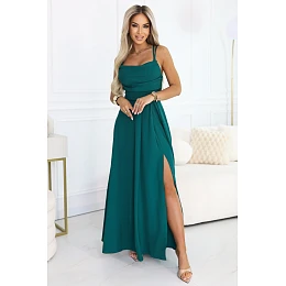 Když plánujete důležitý výstup, tento maxi šaty vám pomohou vytvořit dokonalý outfit a cítit se sebevědomě. Hluboký odstín zelené se hodí k zlaté bižuterii a lodičkám, takže se skvěle hodí jako šaty na svatbu nebo večeři. Je to nabídka pro ženy, které chtějí vypadat klasicky a zároveň se odlišovat detaily. Model má přiléhavý vršek na tenkých ramínkách a elegantně se skládající dekolt s jemným záhybem. Dlouhá sukně má efektní rozpork na noze, který usnadňuje pohyb a zdůrazňuje postavu. Vzadu upoutá pozornost křížící se ramínka a korzetové šněrování na zádech, které umožňuje lépe přizpůsobit šaty pasu. Polská výroba.