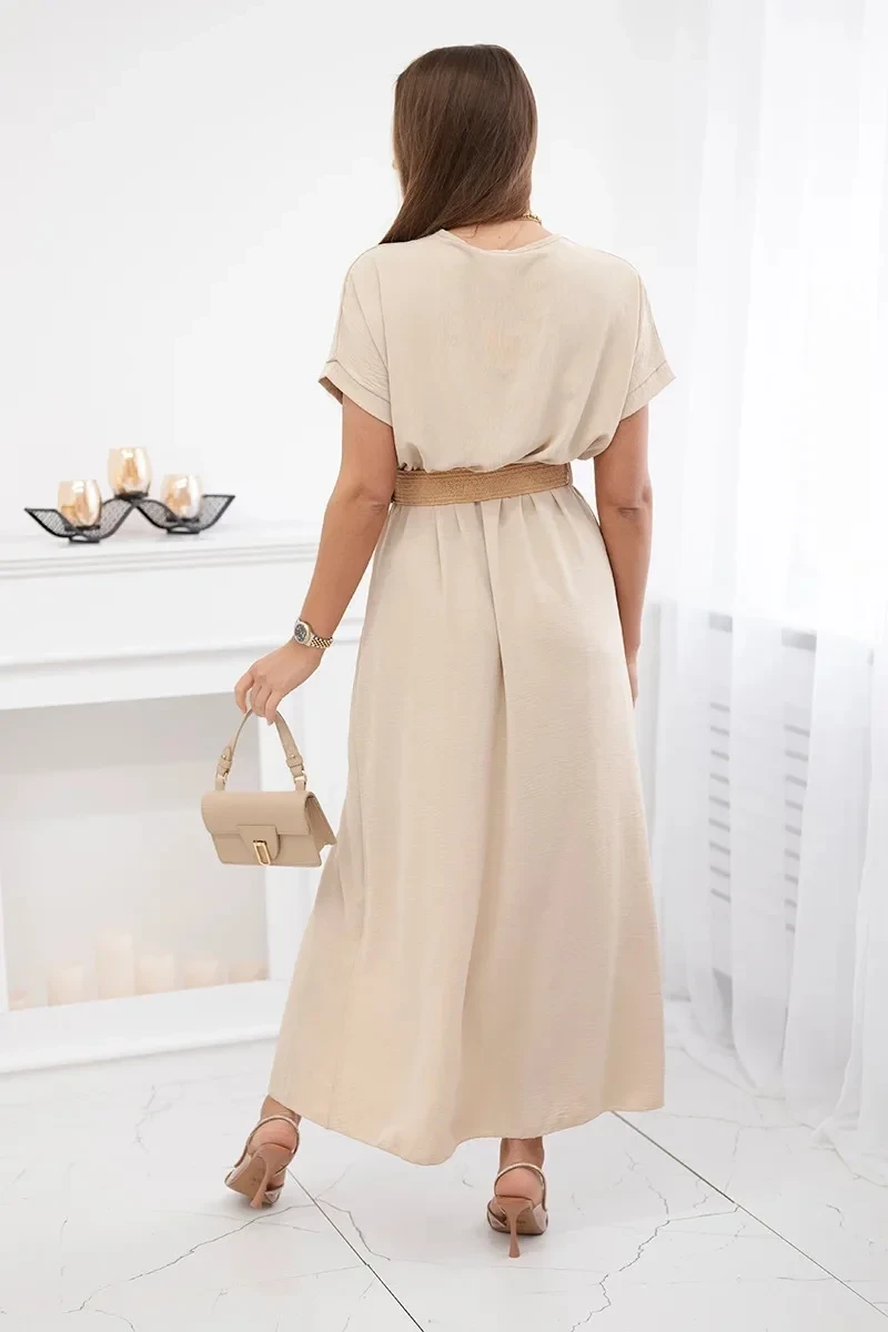Dlouhé šaty s ozdobným páskem béžové