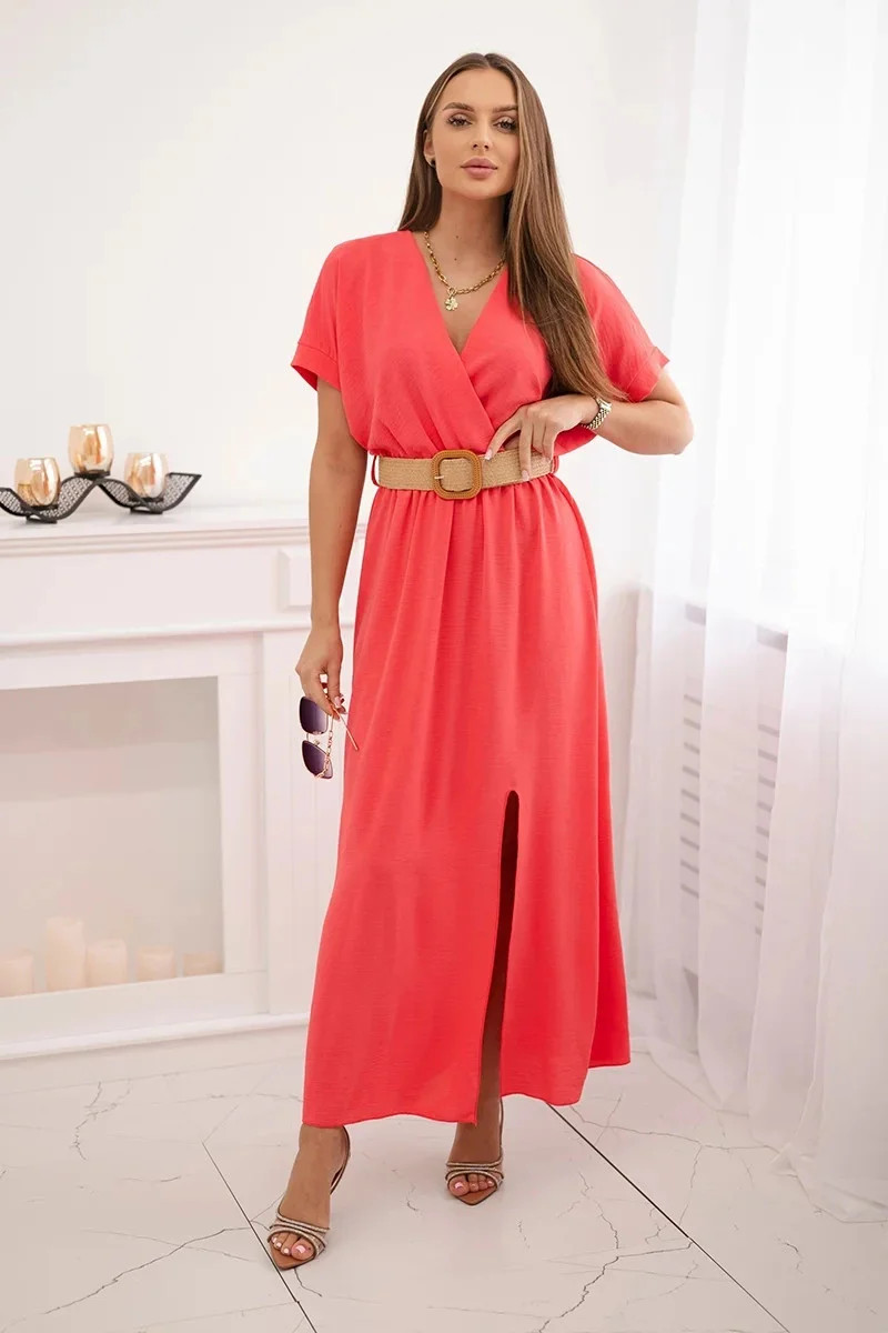 Dlouhé šaty s ozdobným páskem Růžový neon