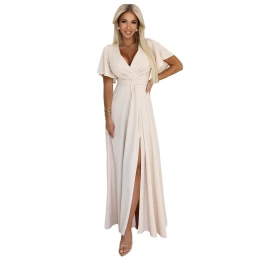 Elegantní béžové maxi šaty s výstřihem, splývavými rukávy a rozparkem na noze. Ideální pro zvláštní příležitosti. Polský výrobek - značka Numoco.