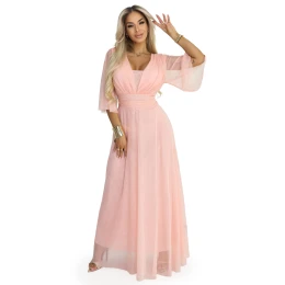Dlouhé třpytivé plus size šaty s výstřihem a rukávy broskvová barva model 21961748 - numoco basic