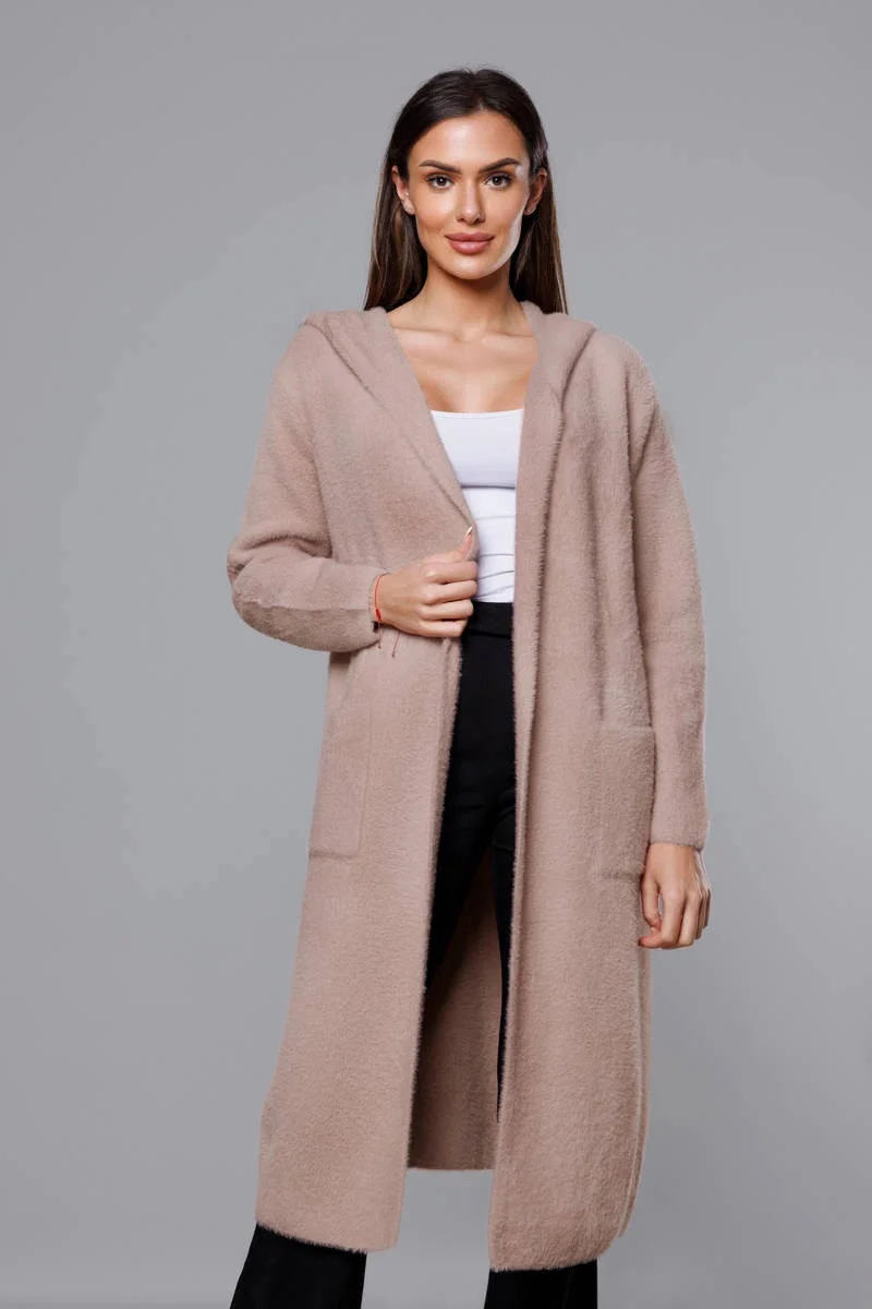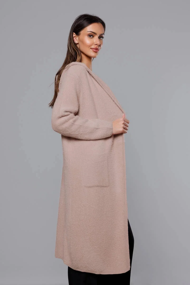 Dlouhý béžový vlněný přehoz přes oblečení typu alpaka s kapucí (M105-1)