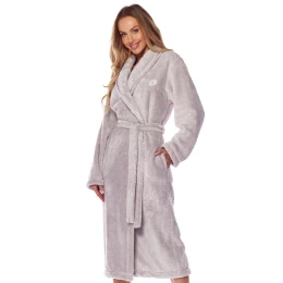 Dlouhý dámský župan, který je vyrobený z měkké tkaniny typu "soft".