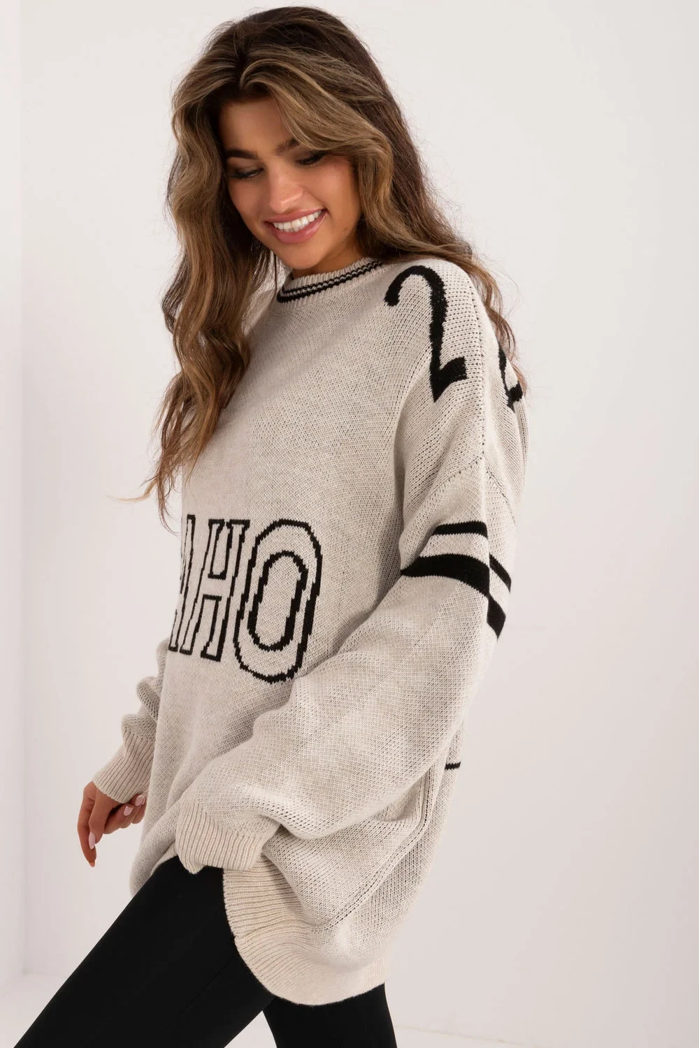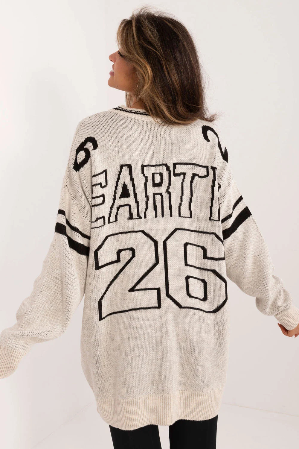 Dlouhý svetr s potiskem, ideální na každodenní příležitosti v casual stylu. Má klasický, kulatý výstřih a dlouhé rukávy pro pohodlné nošení. Vyroben z akrylu s přísadami, svetr je měkký a teplý, skvělý na chladnější dny. Výrazný potisk dodává charakteru a dělá z tohoto svetru módní volbu na každý den.