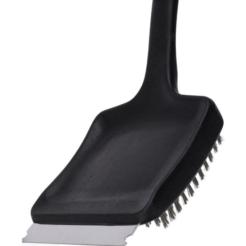 Metalowy skrobak umieszczony na końcu szczotki pozwala na usuwanie wyjątkowo uporczywych, przypalonych zabrudzeń, z którymi samo włosie może sobie nie poradzić. Dzięki jego ostrej krawędzi można skutecznie zeskrobać zaschnięty tłuszcz i resztki jedzenia bez ryzyka uszkodzenia rusztu. To praktyczne uzupełnienie szczotki, które znacznie zwiększa jej funkcjonalność i przyspiesza czyszczenie grilla.