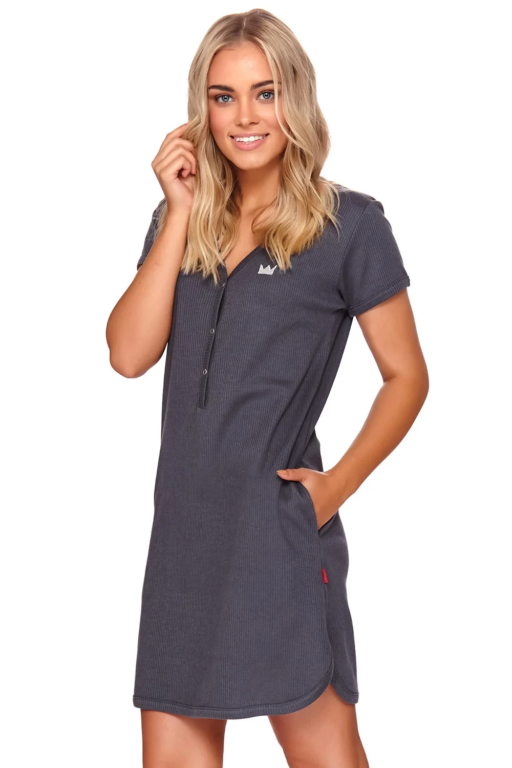 Noční košile značky Doctor Nap. model TCB.4115. výrobek je vyroben ze 100% bavlny. těhotenské oblečení. místo zapínání: vpředu. má kapsy. zapínání noční košile na patentky. délka rukávů: krátké. délka: midi. dámský výrobek. typ výstřihu: do V.