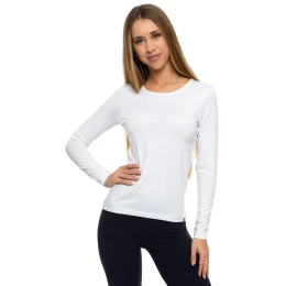 Bluzka marki Moraj. Model DP 1600-001. Produkt został wykonany z 95% bawełna, 5% elastan. Zalety produktu: klasyczna basic bawełniana. Produkt damski. Długość rękawa: długi rękaw. Rodzaj dekoltu: okrągły.