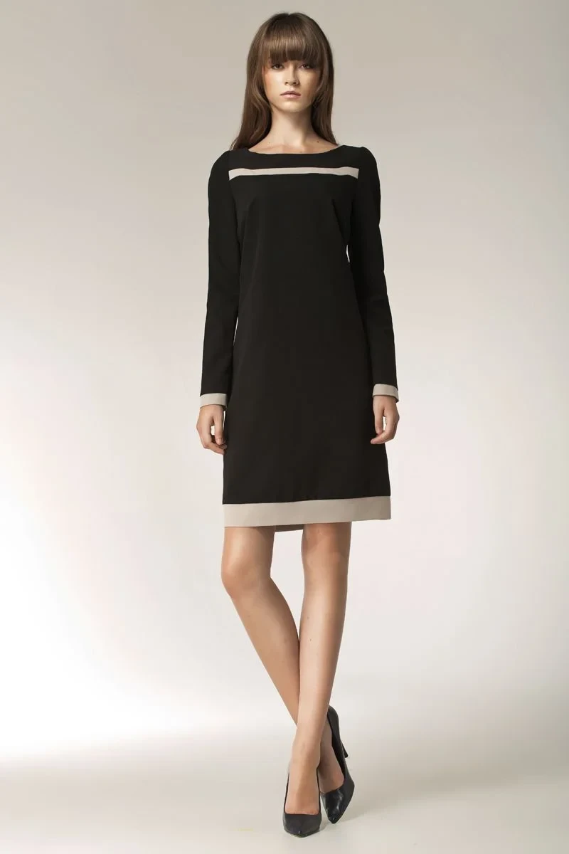Vysněné šaty všech milovníků retro stylu! Dlouhý rukáv se bude hodit i v chladnějších dnech. Rovně střižený výstřih zdobený béžovým lemováním zvýrazňuje linii ramen. Jemně rozšířený spodní okraj dodá siluetě lehkost. Lehčí vložka zvýrazňuje stehna. Krémová barva je v tomto případě trefou do černého.