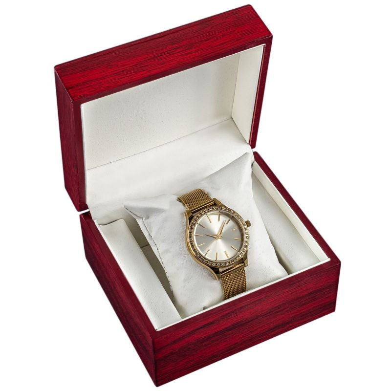 Mahagonové dřevo vyzařuje prestiž a pečlivé lakování mu dodává hloubku přirozené krásy. Jedná se o skutečně exkluzivní způsob uložení hodinek, který je nejen chrání, ale také jedinečným způsobem vystavuje. Vnitřek krabičky je vyložen měkkým materiálem a speciálně navržený polštářek zajišťuje dokonalé uložení každých hodinek a chrání je před poškrábáním a poškozením.
