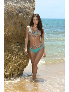 Vyztužená podprsenka typu "bardotka" má kostice. Košíčky jsou ve středu modelu nařasené a jsou ozdobené lemovkou v kontrastní barvě. Podprsenka se na zádech zapíná. Ramínka je možné nastavit i odepnout. Vzorované kalhotky barevně ladí s podprsenkou a v pase jsou ozdobené nařasením.