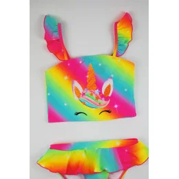 Dívčí dvoudílné plavky, barevné. Ramínka zdobená volánkem, rychleschnoucí tkanina.