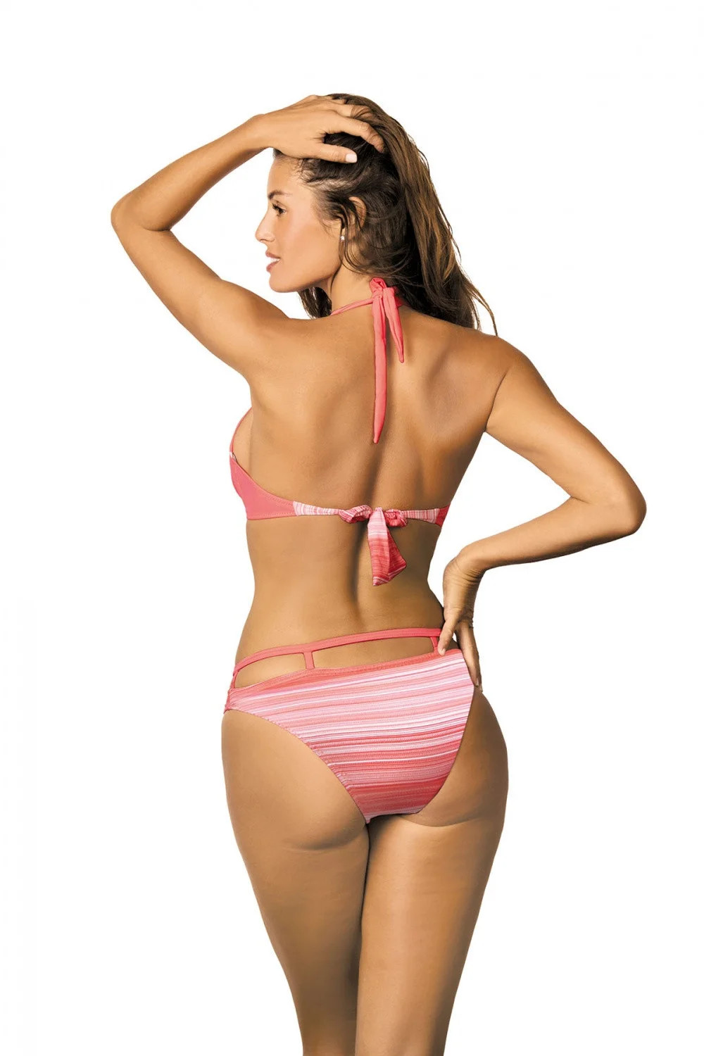 Krásné dvoudílné plavky s dobře tvarovanými košíčky. Takový, který vytváří lákavý výstřih. Košíčky dokonale shromažďují prsa, dobře je tvarují a zároveň je vytahují. Jsou vyztužené zevnitř a obohacené o vestavěnou push up výplň (k dispozici ve všech velikostech) s bočním podšitím. Pěkné lemování okamžitě upoutá pozornost. Popruhy s broží, elegantní, uvázané na krku. Obvod je pohodlně svázán na zadní straně. V dolní části je jemně nařasená tkanina, která podtrhuje jedinečný charakter plavek. Kalhotky mají přídavný pásek, který obepíná boky. Měkké, s podšívkou.