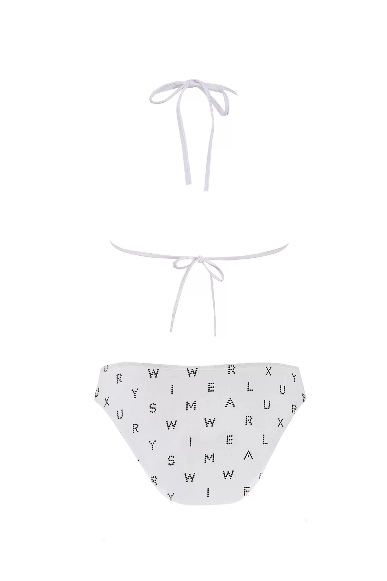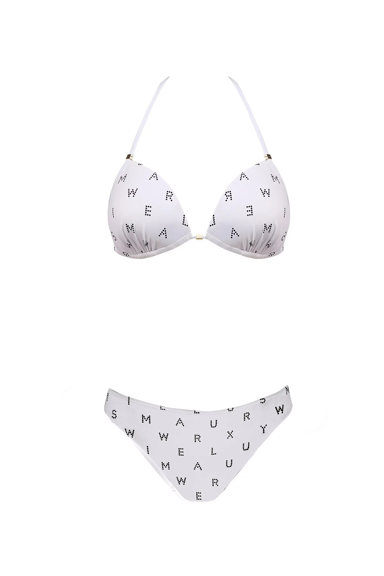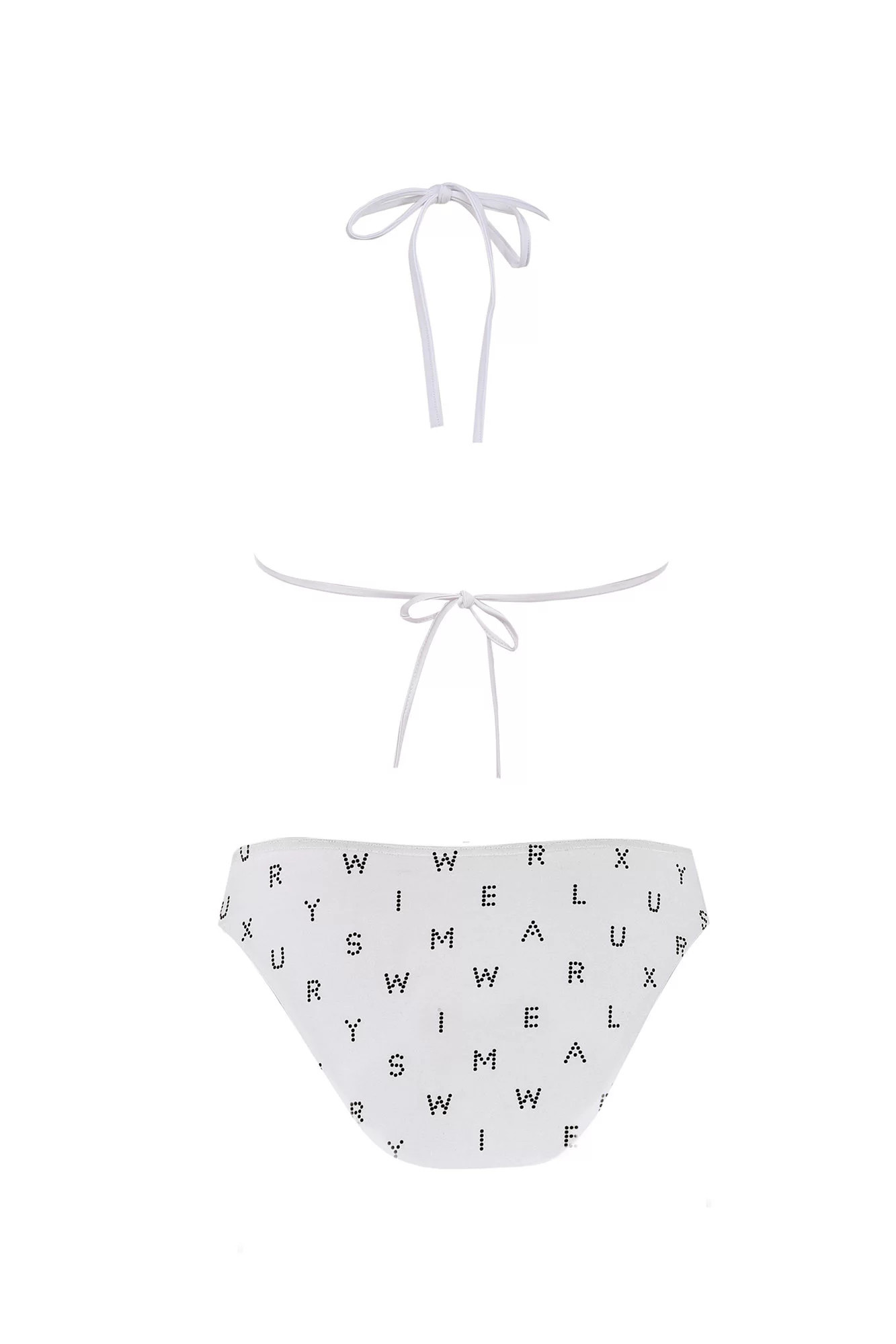 Dvoudílné dámské plavky, vrchní díl mírně vyztužený, bez kostice, spodní část podprsenky na posouvání. Vzadu na zavazování za krem a na zádech.